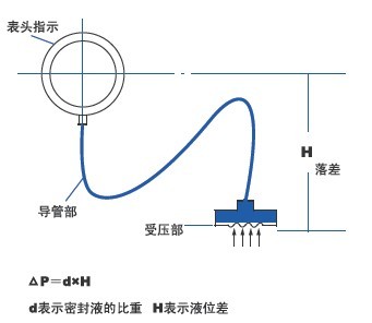 尤其对于带软管连接管的隔膜压力表,由于受压部与通用型压力表安装位置不同,会产生如下图所示的液位差的影响量P