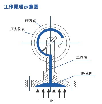 当测量介质的压力P作用于隔膜,则隔膜产生变形,压缩压力仪表测压系统的密封液,使其形成 P-P 的压力。当隔膜的刚性足够小时,则P也很小,压力仪表测压系统形成的压力就接近于测量介质的压力。