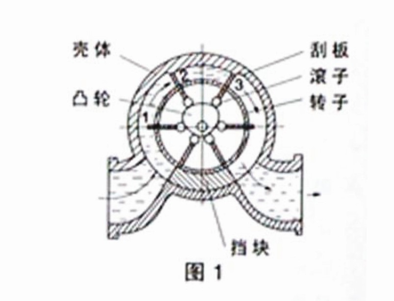 如图所示,刮板在流体的推动下带动转子一起转动,转动过程中刮板在固定的凸轮的作用下依此伸出缩回,连续地与壳体壁形成计量腔计量流体体积,计量腔的容积是固定的,因此,转子的转数与流过流量计的流体体积成正比,通过减速机构在计数器中得到流体体积。