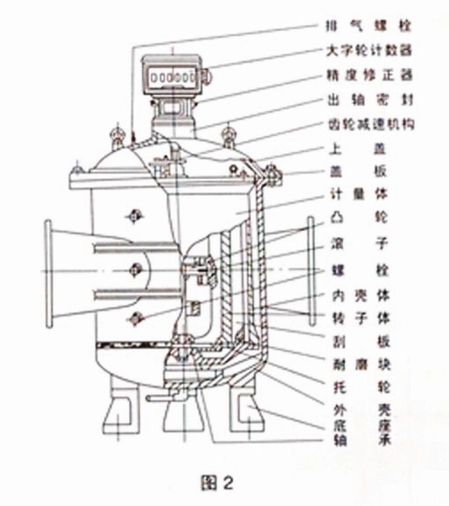 刮板流量计主要由壳体、计量体、齿轮减速机构、出轴密封机构,精度修正器、计数器等组成。