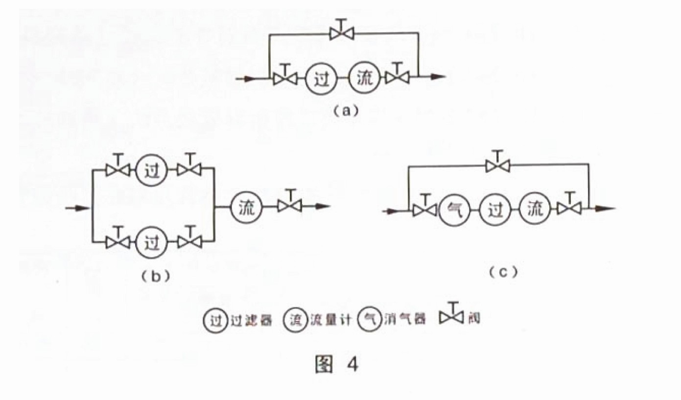 过滤器,消气器等应安装在流量计上游管道,流量调节阀门则应安装在下游管道。