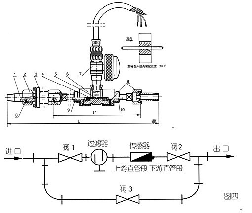 、为了检修时不至影响液体的正常输送,应在传感器两端的直管段外安装旁通管道(如图四);