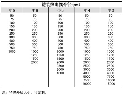 铠装热电偶外径和名义长度标准规格