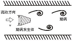 在测量管中垂直插入一个柱状物时,流体通过柱状物两侧就交替地产生有规则的旋涡(如图所示),这种旋涡列被称为卡门涡街。卡门涡街的释放频率与流体的流动速度及柱状物的宽度有关,可用下式表示: