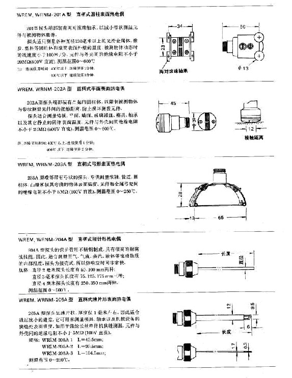 WREM,WRNM系列表面热电偶分手柄式和直柄式两种手柄,有七种形状探头,可根据被测物体的不同形状和需要选择本系列探头专供测量各种形状的固体介质表面温度,以及测量液体、气体和橡胶内部的温度,使用范围很广。